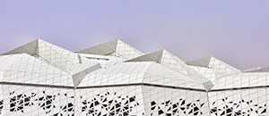 King Abdullah Petroleum Studies and Research Center, Saudi Arabia. The King Abdullah Petroleum Studies and Research Center (KAPSARC) in Riyadh, Saudi Arabia, is a premier, globally recognized center for energy, environmental research, and policy studies. Covering an area of 70,000 m² (753,470 ft²), the facility includes the Energy Knowledge Center, Energy Computer Center, Conference Auditorium, Research Library, and Prayer Hall. The main building consists of a concrete-framed structure with a basement and three floors. The building envelope consists of glass-fiber-reinforced concrete (GFRC) cladding panels and glazing attached to steel frames. The design concept of the center is a cellular, partially modular system that integrates different buildings as a single assembly with interconnecting public spaces. The hexagonal prismatic honeycomb structures use the least material to create a lattice of cells within a given volume. This structural and organizational principle determined the building’s composition as a mixture of crystalline forms that emerges from the desert landscape, evolving to best respond to the environmental conditions and internal functional requirements. The honeycomb grid is compressed toward its central axis as an extension of the natural wadi that runs to the west.
