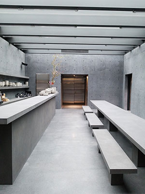 SSENSE MONTRÉAL, Québec, Canada. SSENSE is a business based in Montréal with a global reach, serving 150 countries and generating an average of 76 million page views per month. It is best known for its selection of high-end clothing for men and women. SSENSE MONTRÉAL is located at 418 Saint-Sulpice Street. It is a six-story building built in 1866, and it is directly adjacent to Notre-Dame Basilica. The historical façade of the building was preserved and encloses a cast-in-place concrete structure in which the concrete architecture is exposed and explicit. SSENSE MONTRÉAL celebrates the first building in Canada designed by David Chipperfield Architects. The café, located on the top floor and with a seating capacity of 34, offers a relaxed and inventive culinary experience. It features a concrete counter and a customized common table, as well as a glass ceiling over the exposed concrete structure that covers the entire space and provides an unobstructed view of the sky. SSENSE MONTRÉAL is a hub of activity, where human experience, creativity, and interaction are at the forefront.