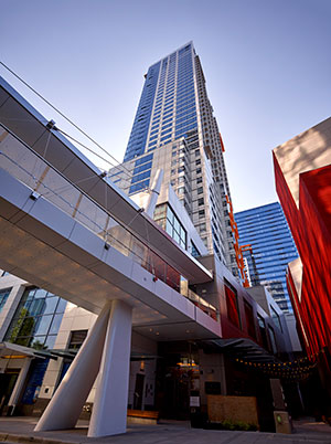 W Hotel Tower, Washington, United States. The dramatic 41-story W Hotel Tower features luxury on a grand scale. Located in the heart of downtown Bellevue, WA, it includes 245 hotel rooms and 231 upscale apartments atop a three-level podium. The podium includes boutique shops, a variety of themed restaurants, a state-of-the-art IMAX theatre, and other recreational amenities for the public, apartment dwellers, and hotel guests. The six-level subterranean parking structure provides 2200 spaces and connects to the adjacent Lincoln Square North via a tunnel, creating a massive parking network for over 4000 vehicles.
