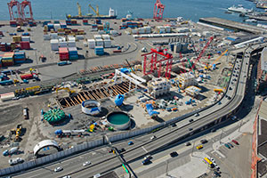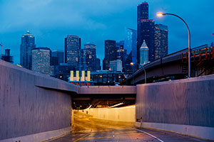Alaskan Way Viaduct Replacement Program, State Route 99 Tunnel, Washington, United States. The largest soft-ground bored tunnel in North America, the 2 mile (3.2 km) State Route 99 tunnel, with a 52 ft (16 m) excavated diameter, replaced the aging Alaskan Way Viaduct as a critical part of one of the largest infrastructure projects in the United States. The tunnel’s alignment runs under 158 downtown Seattle buildings, including single-story structures and high-rises as well as at-grade and elevated roadways, active bridges, an active railroad tunnel, several large sewers, and public and private utilities. The tunnel’s 32 ft (10 m) wide roadways carry two southbound lanes atop two northbound lanes. The tunnel features state-of-the-art fire detection, fire suppression, and ventilation systems; a security system with closed-circuit TVs; and a separate, completely pressurized evacuation area with its own ventilation system—the first of its kind.