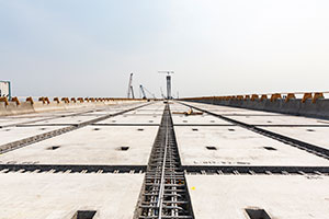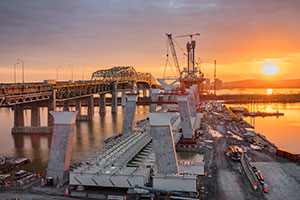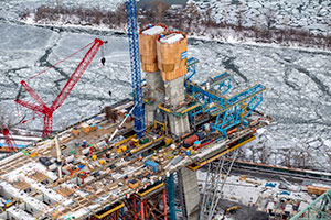 Samuel de Champlain Bridge, Québec, Canada. The Samuel de Champlain Bridge Corridor Project extends over 8.4 km (5.2 miles) and was built to replace the original Champlain Bridge with a new structure measuring 3.4 km (2.1 miles) in length. Designed for a 125-year service life, the new iconic bridge serves as a gateway from the United States to Montréal while representing one of the largest and most important transportation infrastructure projects in this historically rich urban region as well as North America. The bridge comprises six traffic lanes, extra-wide shoulders, a transit corridor designed to accommodate a light-rail transit system, and a multiuse path for pedestrians and cyclists. The project involved extensive use of precast concrete elements—particularly the piers—and the upper portion of the main span tower was built using sophisticated self-climbing forms. The project also includes the construction of a second bridge with a 500 m (1640 ft) span linking Île des Soeurs to the island of Montréal as well as the widening of Highway 15, which passes through the city’s urban zone.