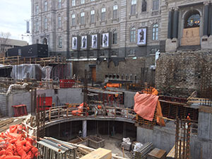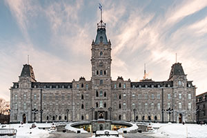 Amélioration des infrastructures de l’Assemblée nationale du Québec, Québec, Canada. This project’s bold architectural concept helped preserve the heritage, symbolic, and identity-related character of the Parliament building, recognized as a national historic monument of Québec since 1985. By building the reception center under the landscaped areas facing the Parliament, the monumental staircase and architectural integrity of the heritage building designed by Eugène-Étienne Taché were preserved and enhanced. The new reception center, which opened its doors on May 29, 2019, is made up of three underground levels facing the Parliament and one level under the inner courtyard. Both areas are linked together by a 21 m (69 ft) long by 4.5 m (15 ft) wide reinforced concrete tunnel dug into the rock under the main wing of the Parliament building.