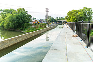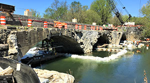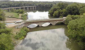 Conococheague Aqueduct Rehabilitation, Maryland, United States. The historic Conococheague Aqueduct on the Chesapeake and Ohio Canal in Williamsport, MD, was restored using a combination of historic and modern materials and methods. This water-filled, three-arch bridge carried canal boats over the Conococheague Creek from 1835 to 1924. One of the aqueduct’s stone walls was replaced with a timber wall with outriggers in 1920, after a canal boat broke through and fell to the creek below, and the repair served until the aqueduct was permanently closed after two floods in 1924. The modern restoration included repairs to the existing stonework, construction of a concrete channel, and installation of timber outriggers to replicate the bridge’s 1920s appearance. With the construction of a canal turning basin and restoration of water in the aqueduct, the repair and restoration project now allows visitors to ride a boat across the historic Conococheague Aqueduct and through a working canal lock.