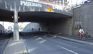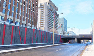 Berri-Sherbrooke Underpass Rehabilitation, Québec, Canada. The Berri-Sherbrooke underpass is in the heart of Montréal. Built in 1955, it allows for the passage under Sherbrooke Street of two lanes of traffic in both directions, one particularly busy bicycle path, and one sidewalk. The site is divided into five structures: one rigid-framed, two-span bridge in reinforced concrete and four retaining walls, also in reinforced concrete. The bridge was repaired in 2004, but the retaining walls presented major deficiencies and needed rehabilitation. The work was carried out over 2 consecutive years, with a break in winter. Landscaping work was completed in the spring of 2020.