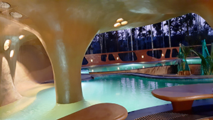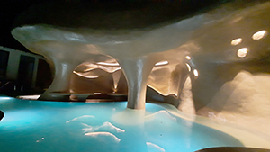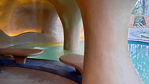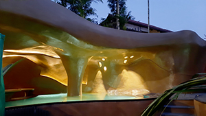 The Cave That Travelled, Kerala, India. This project was imagined as an experiential sculpture in the form of a pavilion and deck for a swimming pool. The character of the ferrocement shell as a “cave” is emphasized by the continuity of the facia, the soffit, the wall, the seats, and the floor that flow seamlessly as one continuous surface indistinguishable from one another. Ferrocement was the material of choice because it allowed fluidity of form and shape as well as the ability to design the morphed surfaces offsite. At site, the retaining wall and top slab were kept ready to receive the shell; and the fabrication mesh pieces were rewelded in position and fixed to the slab and retaining wall. A 2 mm (8 mil) thick cementitious color coat was applied.