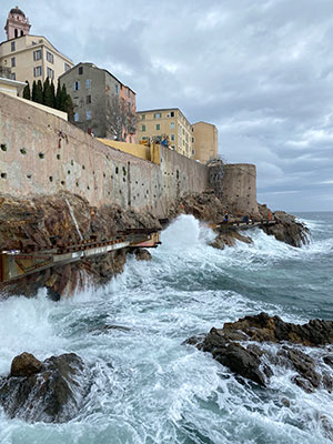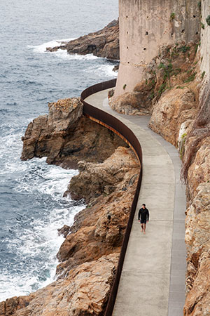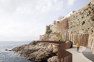 Aldilonda promenade around Bastia fortress, Corse-du-Sud, France. Constructed at the foot of the Bastia fortress on the island of Corsica, the Aldilonda promenade is a sinuous path set into rock, giving pedestrians, disabled people, and cyclists access to 450 m (1480 ft) of coastline. The pathway unfolds like a suspended balcony over the water, following the contours of the meandering coastline and allowing ramblers direct contact with the rocky cliff. The reinforced concrete pathway pierces the rock below the fortress to connect the city’s north and south parts through a tunnel constructed using board-formed architectural concrete.