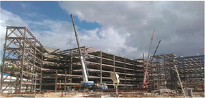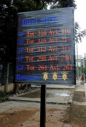 INTEL Multi-Level Car Park, Karnataka, India. This project involved the design and turnkey construction of a parking structure for 2200 cars with 65,900 m² (710,000 ft²) of built-up area and an overall height of 14.96 m (49 ft). This facility is one of the largest composite multi-level parking structures in India. The floor system is a composite slab on metal deck supported on steel beams and steel columns. This semi-exposed building was designed to maximize use of natural daylight and ventilation. Completely prefabricated steel was delivered and assembled on-site with almost no requirement of site welding to maximize output, achieve better quality control, and improve logistics management on site (due to space constraint and adjacent operational facilities).