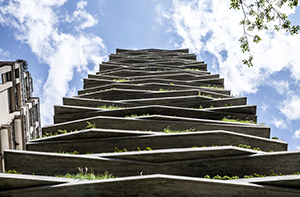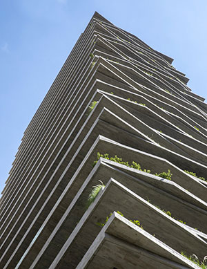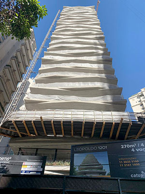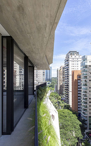 Leopoldo 1201, São Paulo, Brazil. The Leopoldo 1201 residential building has a total built area of 10,974 m² (118,120 ft²) within 1125 m² (12,100 ft²) of land, with four underground floors, a ground floor, and 23 stories. This building has one house/apartment per floor and a penthouse at the top. The architectural concrete façades emphasize the biophilic design of the terraces that have varied designs that vary in thickness and span. The building columns have reduced cross sections to increase the internal free space and to provide more parking spaces; and the architectural concrete of the terraces was formed with a slatted wood texture. These characteristics posed great challenges for the structural design and development of the concrete mixtures.