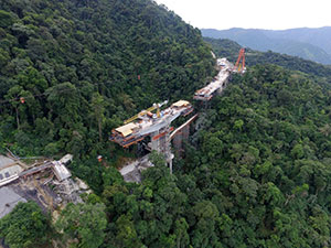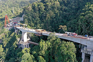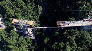 Viaduct V3 in the duplication of Tamoios Highway, São Paulo, Brazil. The Tamoios Highway provides access to a major port and a popular summer destination for tourists. The highway rises 750 m (2460 ft) in elevation and passes through the Serra do Mar State Park, which led to a solution that includes a series of tunnels and viaducts. The Viaduct V3 has a curve radius of about 500 m (1640 ft). The cross section was conceived as a prestressed single-cell box girder, which was built using the cantilever method with cast-in-place segments of 2.5 to 4.5 m (8 to 15 ft).The main span is 125 m (410 ft) long and the smaller, balancing spans are 62.5 m (205 ft) long, with a height that ranges from 6.4 m (21 ft) at the supports to 3.2 m (10 ft) mid-span, as well as a 12.6 m (41.3 ft) width. The superstructure alone consumed 3100 m³ (4055 yd³) of concrete.