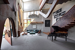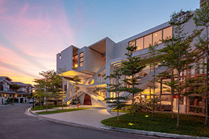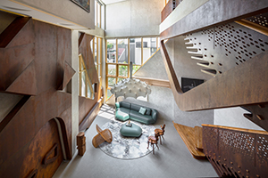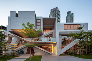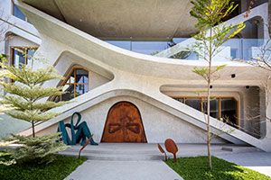 Infinity House, Metro Manila, Philippines. The studio Carlo Calma Consultancy Inc. believes in blurring boundaries in art and architecture while being inspired by the everyday. Because the site of Infinity House was once a kindergarten school, its design is infused with the memory of play, including a pivot-door that is easily accessed by guests and presents a grand welcoming of the street. The home features raw concrete with oxidized metal in surreal forms, such as the curvilinear staircase made of weathered steel. The living area’s triangulated windows create kaleidoscopic light effects. The master bedroom’s connecting balcony becomes an elevated garden and is also a grandkids’ playground and skateboarding space. Butterfly-shaped concrete portals act as a structural element supporting 6 m (20 ft) deep cantilevers.