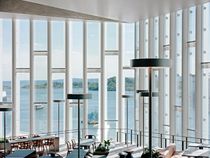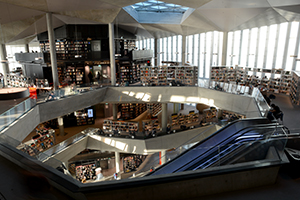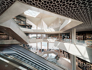 Deichman Bjørvika, Oslo, Norway. Oslo’s new main library, Deichman Bjørvika, opened in 2020 after 6 years of construction. The top of the building cantilevers 18 m (almost 60 ft) out from its footprint. The cantilevered floors are suspended from the concrete roof above. The roof has a characteristic folded geometry that provides structural strength. Three atria cut diagonally through the building, connecting the building’s three entrances, and providing views into the sections of the library. The atria connect the floors and distribute daylight downwards from three big skylights in the roof. The concrete structures around the light shafts and in the folded roof are lasting elements that give the building a permanent and recognizable quality.